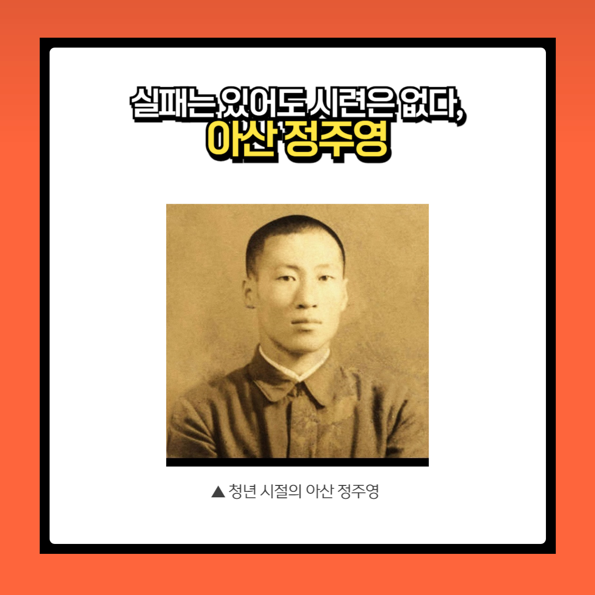 청년 정주영은 175cm의 큰 키에 체력 또한 좋아 힘을 쓰는 것이라면 자신 있었 습니다. 함경북도 청진으로 가 철도 공사가 한창이던 탄광촌 근처에서 막노동을 하기도 하고, 일도 구하지 못한 채 사기를 당하기도 하고, 주산과 경리 학원에 등록하기도 했으나 수 차례의 가출은 아버지에게 끌려오는 것으로 막을 내리게 됩니다.