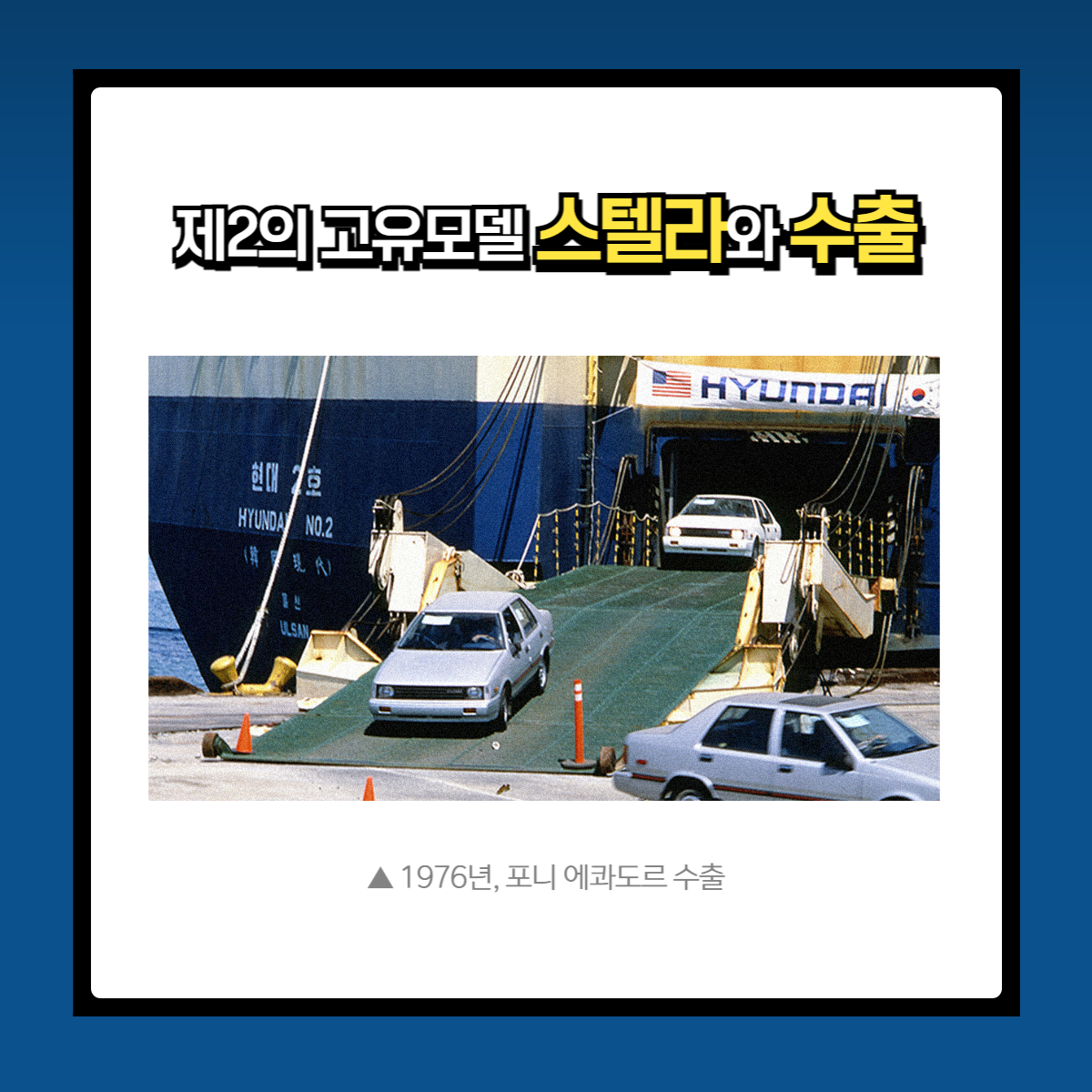 울산의 종합자동차공장이 가동되면서 1977년 4월에는 1트럭 및 3트럭과 현대버스를 생산, 시판하였고 1978년 11월에는 그라나다 승용차와 리어엔진버스를 선보이는 등 본격적인 생산에 돌입했습니다. 1983년 6월 포니에 이은 제2의 고유모델은 스텔라자동차를 생산, 시판했습니다. 포니 생산 50만 대를 넘어선 1984년에는 국내 최초로 캐나다에 포니승용차를 수출하면서 캐나다 현지법인(HMC)을 설립했습니다. 그리고 1985년 5월에는 캐나다에 현지 부품공장을 기공하여 해외 현지에서의 수출 기반을 확고하게 다져나갔습니다.