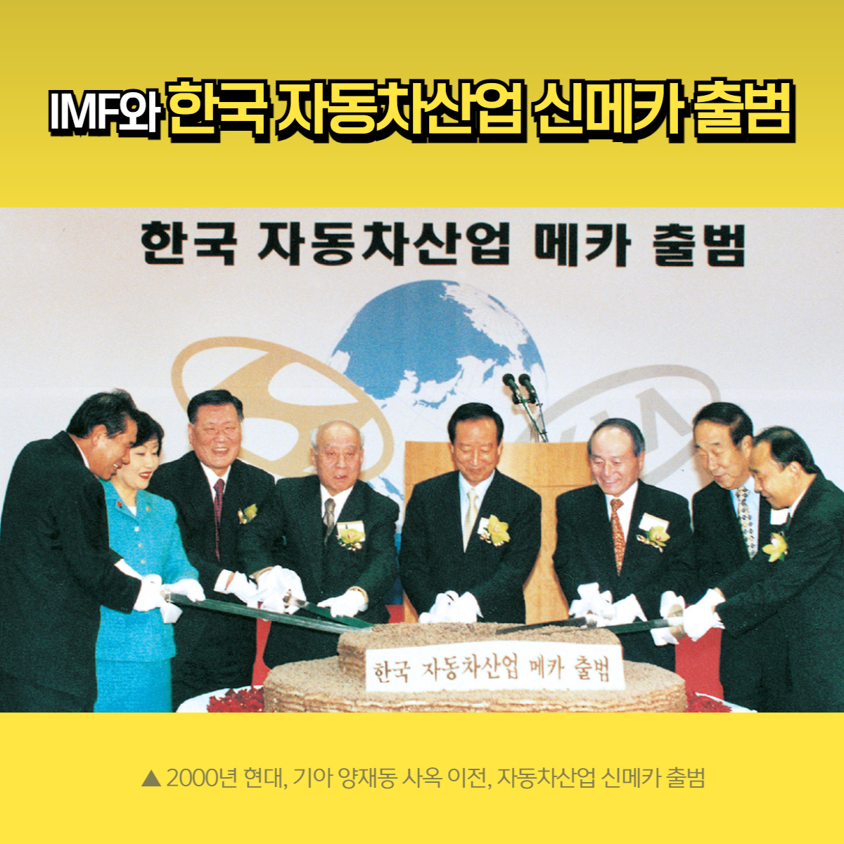 현대자동차의 40년 역사는 1997년 IMF 사태 이전과 이후 시대로 구분할 수 있습니다. 현대자동차 출범 후 IMF까지 30년은 현대자동차가 현대그룹 울타리 내에서 자립 기반을 마련한 기간이었다면, 이후 10년은 구 현대그룹의 해체로 현대자동차가 자동차그룹으로 홀로서며 글로벌 메이커로 도약하는 시기였습니다.