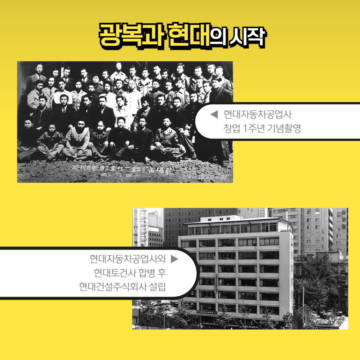 시련에 굴하지 않은 정주영은 1945년 8.15 해방 이후 1946년, 서울 중고 초동 106의 적산 부지 200평을 불하받아 현대자동차공업사를 설립합니다. 사명 '현대'에는 '과거의 낡음'과 대치되는 '새로움'의 의미와 함께 시대를 앞서가고자 하는 의지가 담겨 있었습니다. 이러한 현대자동차공업사의 사업은 날로 번창하여 1년 만에 종업원 수가 7~80명으로 불어나게 됩니다. 정주영은 자동차 수리대금을 받기 위해 미군 부대를 자주 출입하면서 토건업이 유망할 것임을 간파했고, 1947년 5월 25일 현대토건사 간판을 올리게 됩니다. 주변에서 토건업은 위험성이 크다며 말렸지만 "나는 무슨 일을 시작하든 된다는 확신 90%와 반드시 되게 할 수 있다는 자신감 10% 외에 안 될 수도 있다는 불안은 단 1%도 갖지 않는다"는 신념으로 강행했다고 합니다.