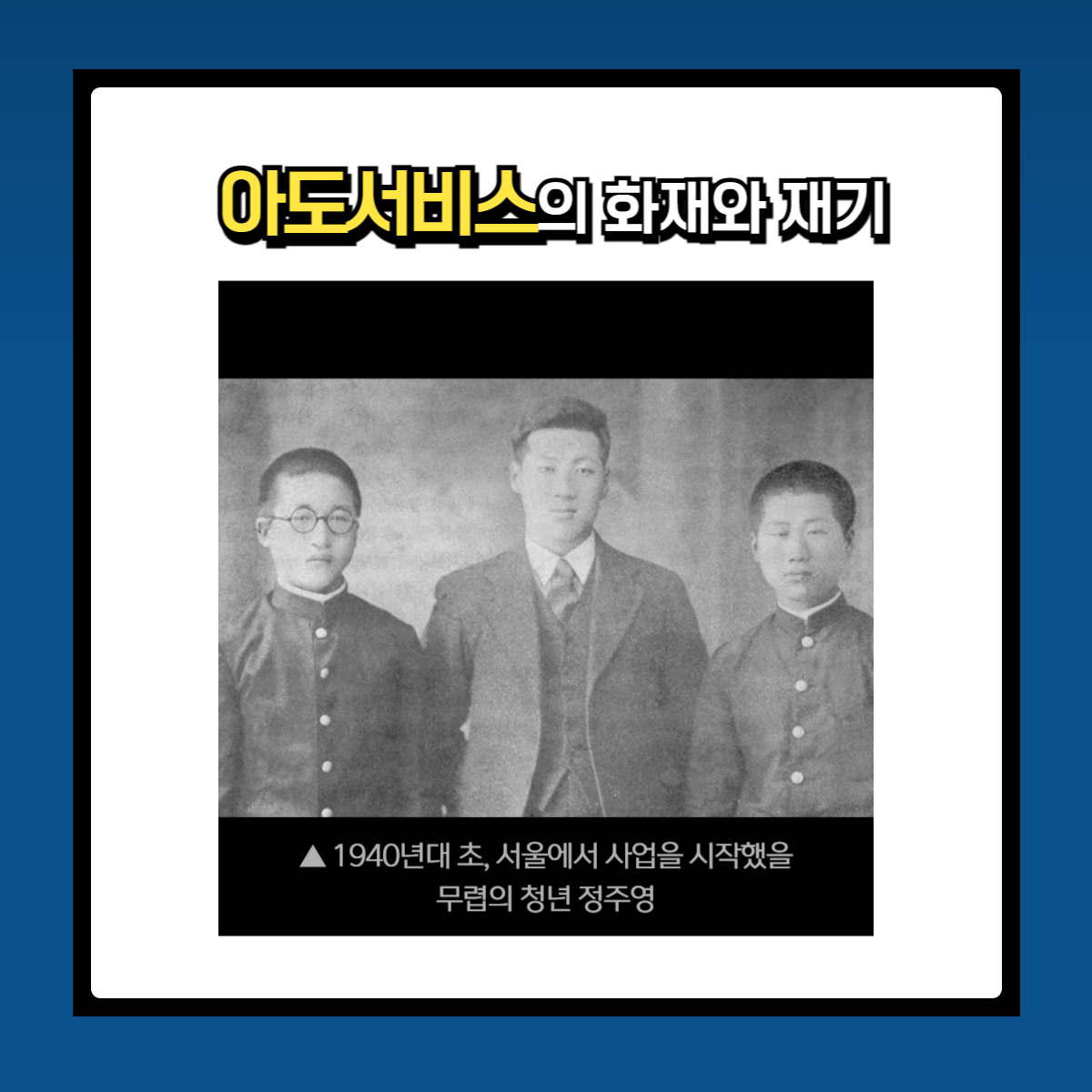 정주영은 경성서비스의 정비 기술자 이을학과 김명현을 끌어들여 아도서비스의 영업을 개시하게 됩니다. 아도서비스는 직원이 80여명에 달할 정도로 크게 운영되었습니다. 이중에는 윤덕영(조선총독부 중추원 제5대 부의장), 당시 조선총독부 경무총장, 화신백화점 사장 박흥식의 차도 있었습니다.  정주영은 빨리, 완벽하게 고치고 수리비는 많이 받는다는 방침으로 사업 성공의 토대를 닦았습니다.