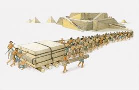 다음으로 찾아낸 방법은 둥근 통나무들을 바닥에 까는 굴림대였습니다. 나란히 깔아놓은 통나무 위로 무거운 짐을 굴리면 마찰력이 크게 줄어 옮기기가 수월했습니다. 하지만 멈추지 않고 운반하려면 돌 앞에 통나무를 계속 깔아주어야 하는 번거로움이 있었습니다.