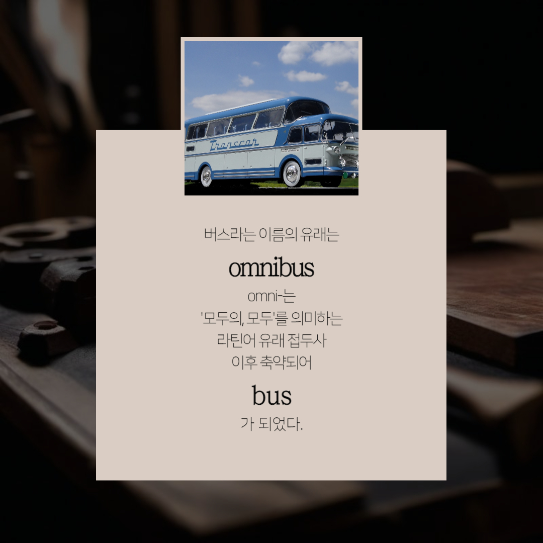 버스라는 이름의 유래는 'omnibus'로 여기서 'omni-'는 '모두의, 모두'를 의미하는 라틴어 유래 접두사입니다. 교통수단에 이러한 이름이 붙은 것은 19세기 였는데,이후 'bus'로 축약되었습니다.
