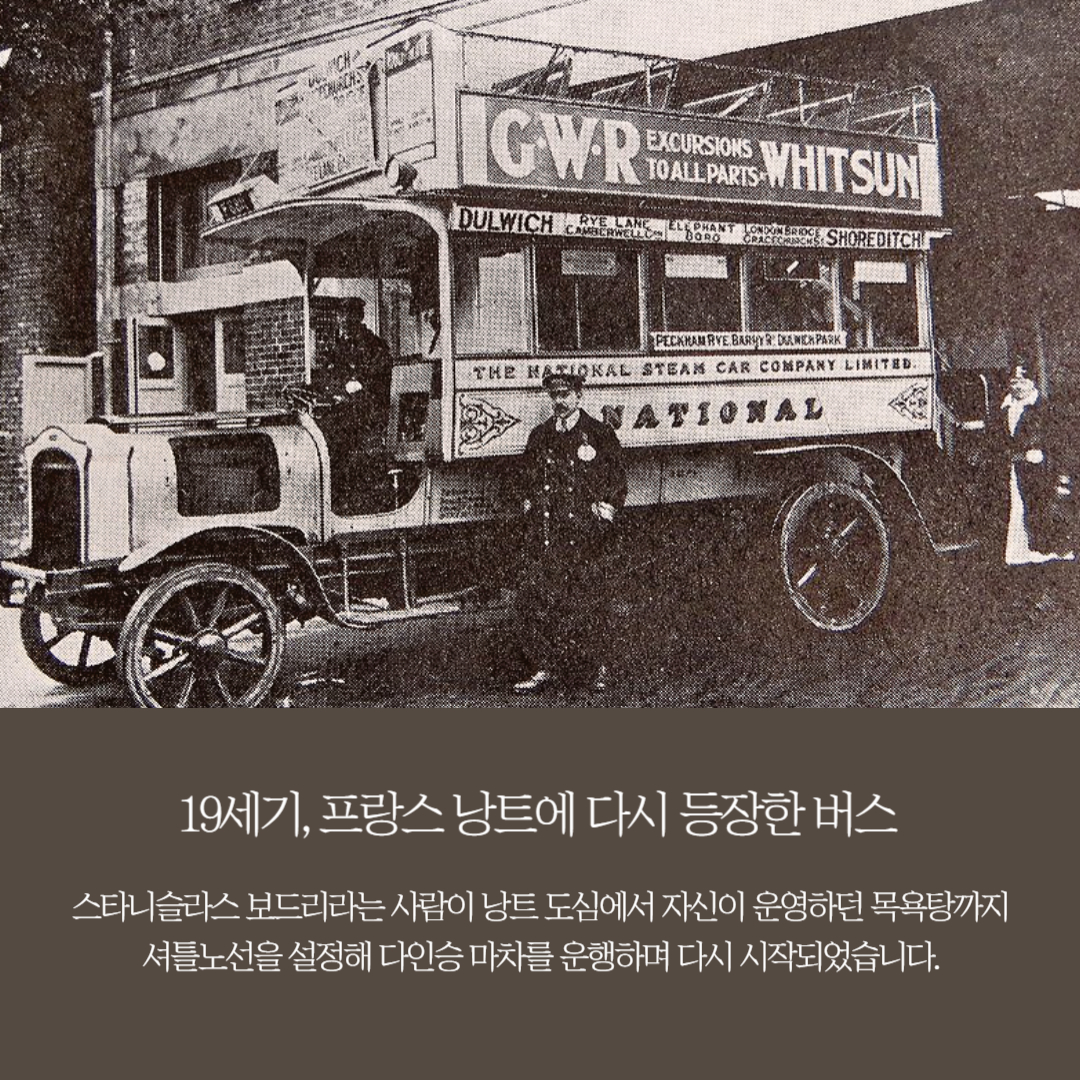 다시 등장한 것은 1826년 프랑스 낭트입니다. 낭트 근교에서 대중 목욕탕을 운영하던 스타니슬라스 보드리라는 사람이 낭트 도심에서 자신이 운영하는 목욕탕까지 셔틀 노선을 설정해 다인승 마차를 운행한 것이 그 출발점이었습니다. 당시 그가 운행하던 버스는 목욕탕 이용과 무관하게 승하차 할 수 있었기 때문에 곧 대중교통 수단이 되었습니다. 이러한 사업이 인기를 끌자 1828년 파리, 1829년 런던과 뉴욕에도 등장하면서 omnibus가 되었습니다.