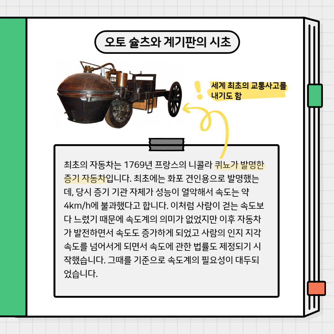 최초의 자동차는 1769년 프랑스의 니콜라 퀴뇨가 발명한 증기 자동차입니다. 최초에는 화포 견인용으로 발명했는데, 당시 증기 기관 자체가 성능이 열악해서 속도는 약 4km/h에 불과했다고 합니다. 이처럼 사람이 걷는 속도보다 느렸기 때문에 속도계의 의미가 없었지만 이후 자동차가 발전하면서 속도도 증가하게 되었고 사람의 인지 지각 속도를 넘어서게 되면서 속도에 관한 법률도 제정되기 시작했습니다. 그때를 기준으로 속도계의 필요성이 대두되었습니다.